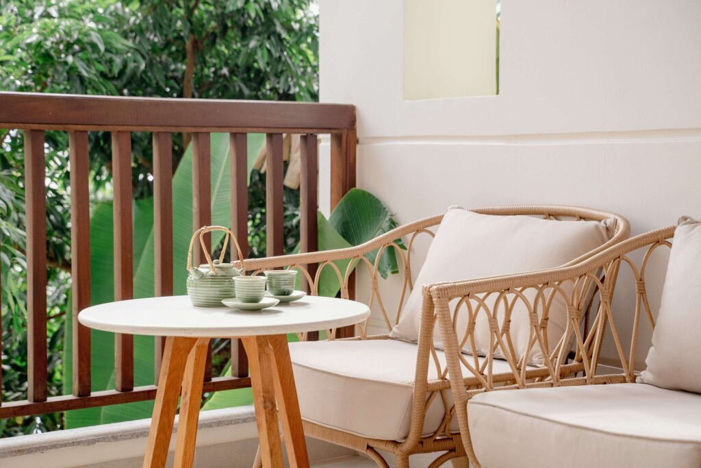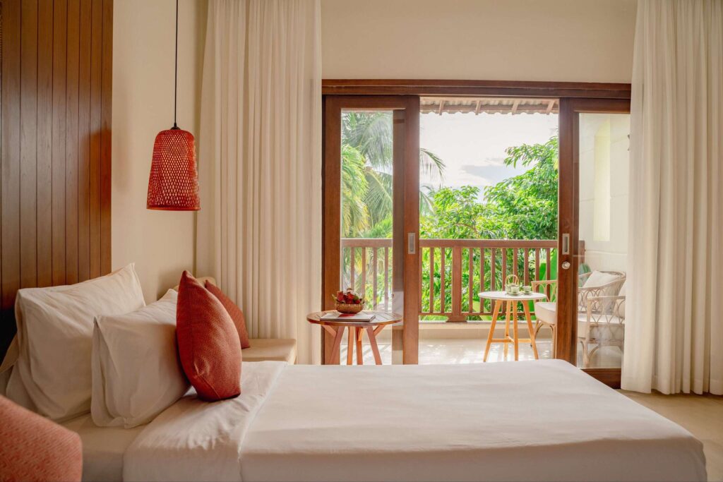 Căn phòng có thiết kế với phòng ngủ nối liền ra ban công, phóng tầm mắt ra biển Dốc Lết ẩn mình sau những tán dừa xanh mướt mát. Phong cách trang trí lấy cảm hứng Á Đông, sử dụng gam màu trầm và họa tiết thổ cẩm, giản dị nhưng tinh tế.